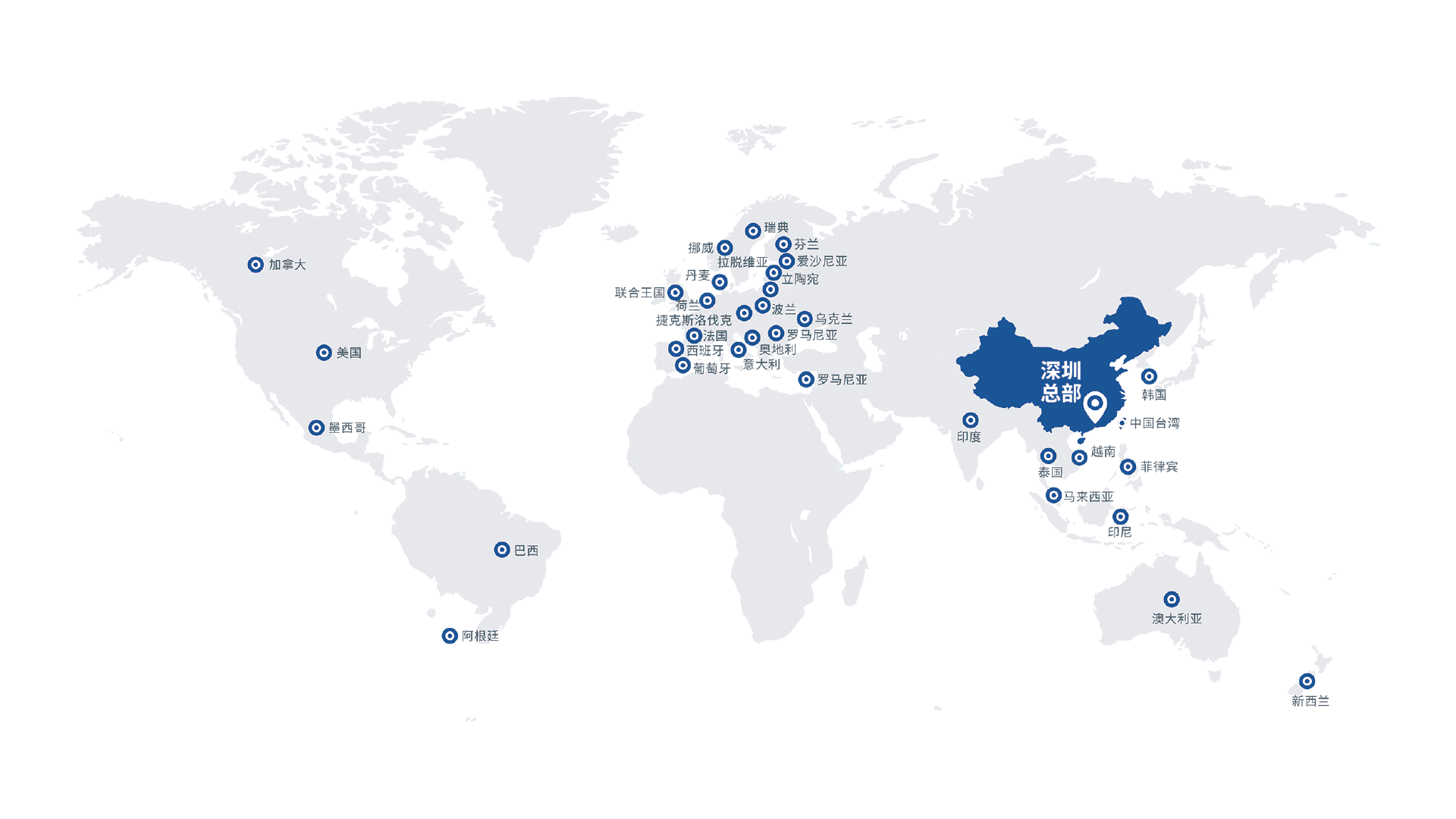 立足于國內(nèi)深圳、張家港、常州、天津、長沙、蘇州、濟南生產(chǎn)基地與備品備件庫,國內(nèi)外轄180+辦事處,在100多個國家和地區(qū)設立銷售服務機構,為全球用戶提供高品質(zhì)的產(chǎn)品與優(yōu)質(zhì)高效的服務。